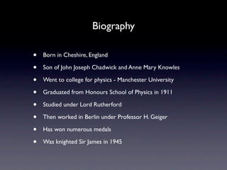 James Chadwick was a British physicist born in England. He studied under Ernest Rutherford and worked with him on experiments involving radioactive substances. This led Chadwick to continue Rutherford's idea that there were neutral particles in the nucleus of an atom. Through his own experiment in 1932, Chadwick was able to prove the existence of the neutron. He called these neutral particles "neutrons" and showed they have about the same mass as a proton but no electric charge. This discovery of the neutron was fundamental to modern physics and earned Chadwick the 1935 Nobel Prize in Physics.