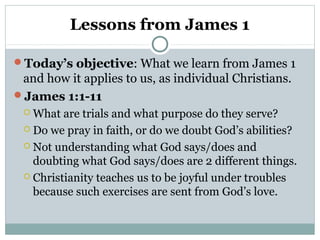 The document outlines the schedule and teachings of the Haynes Street Church of Christ, focusing on lessons drawn from James 1, which emphasize the importance of enduring trials, practicing faith, and applying God's teachings in daily life. It also presents the plan of salvation that includes key steps such as hearing, believing, repenting, confessing, being baptized, and living faithfully. The message encourages believers to seek a deeper relationship with God and embody true Christian values.