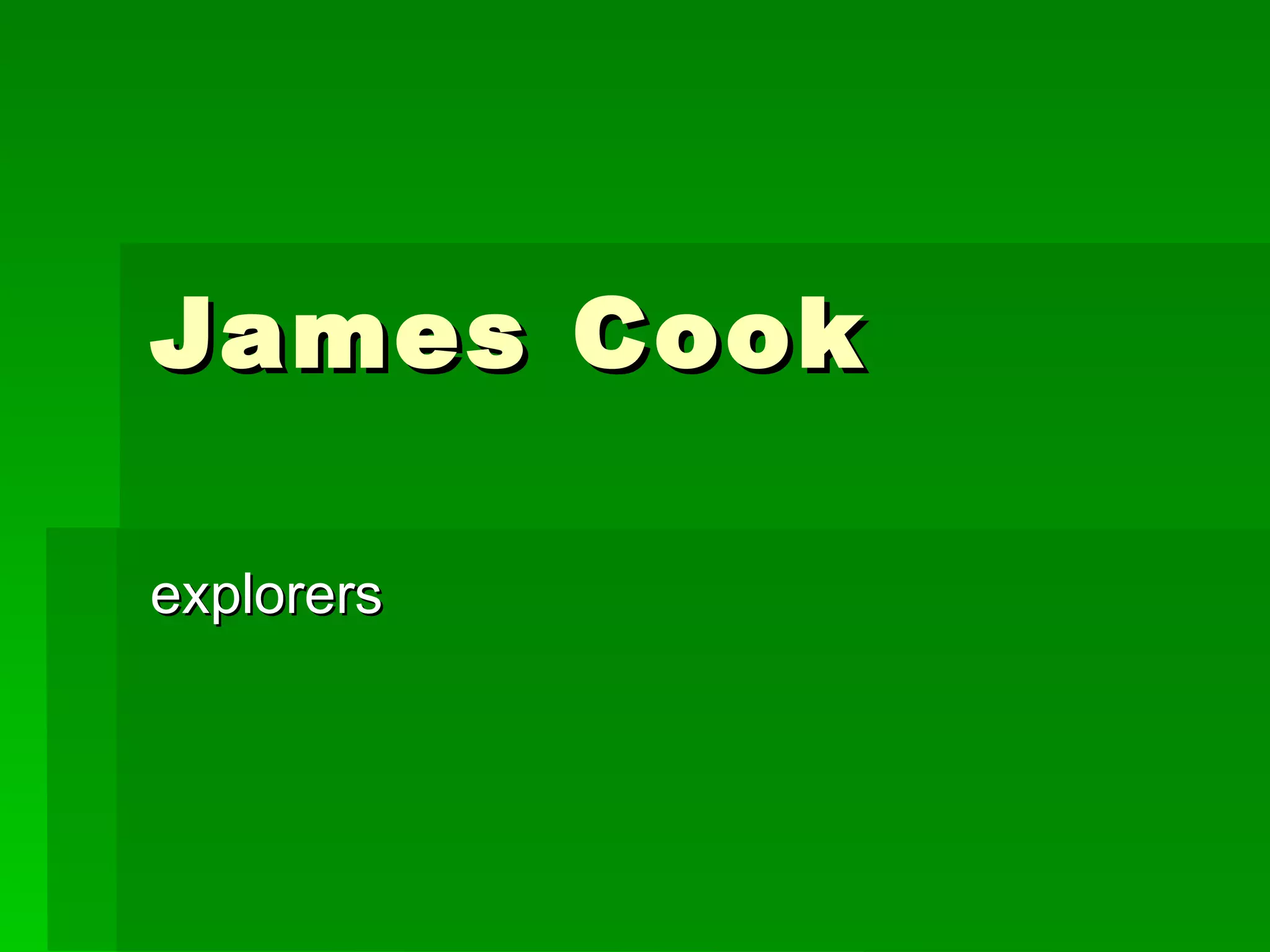James Cook was a British explorer born in 1728 who made three voyages of exploration and discovery in the Pacific Ocean. He mapped much of the region, made accurate navigational charts, and was the first European to visit many islands and lands, including becoming the first to circumnavigate and map Antarctica. Cook commanded three ships, the Endeavour, Resolution, and Adventure, and his explorations greatly expanded European knowledge of the Pacific and contributed to navigational accuracy. He died in 1779 after being stabbed by Hawaiians during his third voyage.