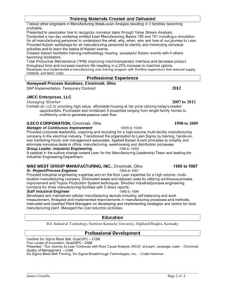 James Criscillis is a Lean Sigma deployment leader with over 20 years of experience implementing continuous improvement strategies to optimize performance. He has a proven track record of transforming traditional manufacturing to Lean through eliminating waste and reducing costs. Criscillis has extensive experience in techniques such as 5S, visual workplace, Kaizen, value stream mapping, and total productive maintenance. He is skilled in analyzing business processes, developing roadmaps for improvement, and coaching teams to implement changes.