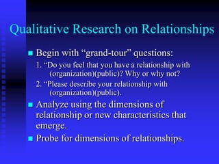 3. At the organizational level, the quality of relationships with stakeholders over the long-term is evaluated by measuring trust, control mutuality, commitment, and satisfaction.