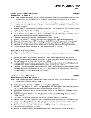 James Gilbert is an experienced project manager and business development professional. He has over 20 years of experience acquiring and managing large, complex projects in various industries. Some of his accomplishments include implementing over $1.45 billion in projects, acquiring a 60% market share of the $2 billion Illinois court debt market, and securing major clients such as several state departments of revenue. He is proficient in project management, business development, client relations, and government lobbying.