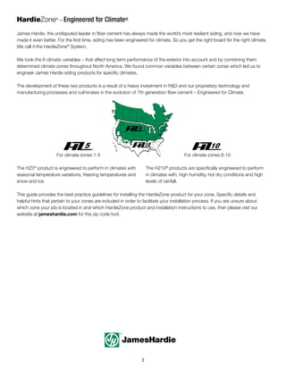 The document serves as an installation guide for James Hardie siding and trim products, highlighting the company's hardiezone® system, which engineers products for specific climate conditions across North America. It includes best practices for installation, safety guidelines, and information on handling and cutting the materials, emphasizing the need to follow current building codes and manufacturer specifications. The guide is intended to support builders and contractors in achieving proper installation and performance of fiber cement products.