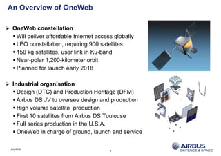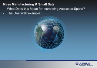 The document discusses the OneWeb satellite constellation aimed at providing affordable global internet access with 900 satellites in a low Earth orbit. It highlights the partnership with Airbus for satellite design and production, emphasizing a rapid and cost-effective manufacturing approach. The focus is on revolutionizing the satellite industry through mass production techniques and quick deployment of services.