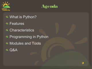 This document provides an overview of the Python programming language. It introduces Python, discusses its uses in industries like Google and Industrial Light & Magic, and covers key Python concepts like data types, functions, object-oriented programming, modules, and tools. The document is intended to explain what Python is and give an introduction to programming in Python.