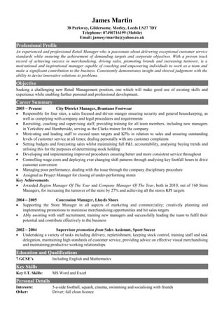 James Martin is an experienced retail manager seeking a new management position. He has over 15 years of experience in retail management, including managing multiple store locations and achieving sales targets. His experience includes managing stock levels, staff training, customer service, and handling complaints. He was recognized as the Region Manager and Company Manager of the Year in 2010 for significantly increasing store sales.