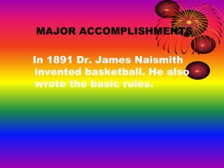 Dr. James Naismith invented the game of basketball in 1891 while looking for an indoor game to keep his students occupied on a rainy day in gym class. He was born in 1861 in Ontario, Canada, had two wives and five children, and worked as a physical education professor. Naismith wrote the original 13 rules of basketball and the game has since become one of the most popular sports worldwide before he died in 1939 in Lawrence, Kansas at the age of 78 from a brain hemorrhage.