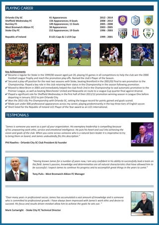 James O'Connor is an ambitious soccer manager currently leading Louisville City FC. He has 15 seasons of experience as a professional player in England and has transitioned to management by applying the lessons of teamwork, accountability, integrity and honesty. At Louisville City, he has established a positive culture where players and staff respect each other, and the team has found success on the field by finishing 2nd in their conference in their first season.