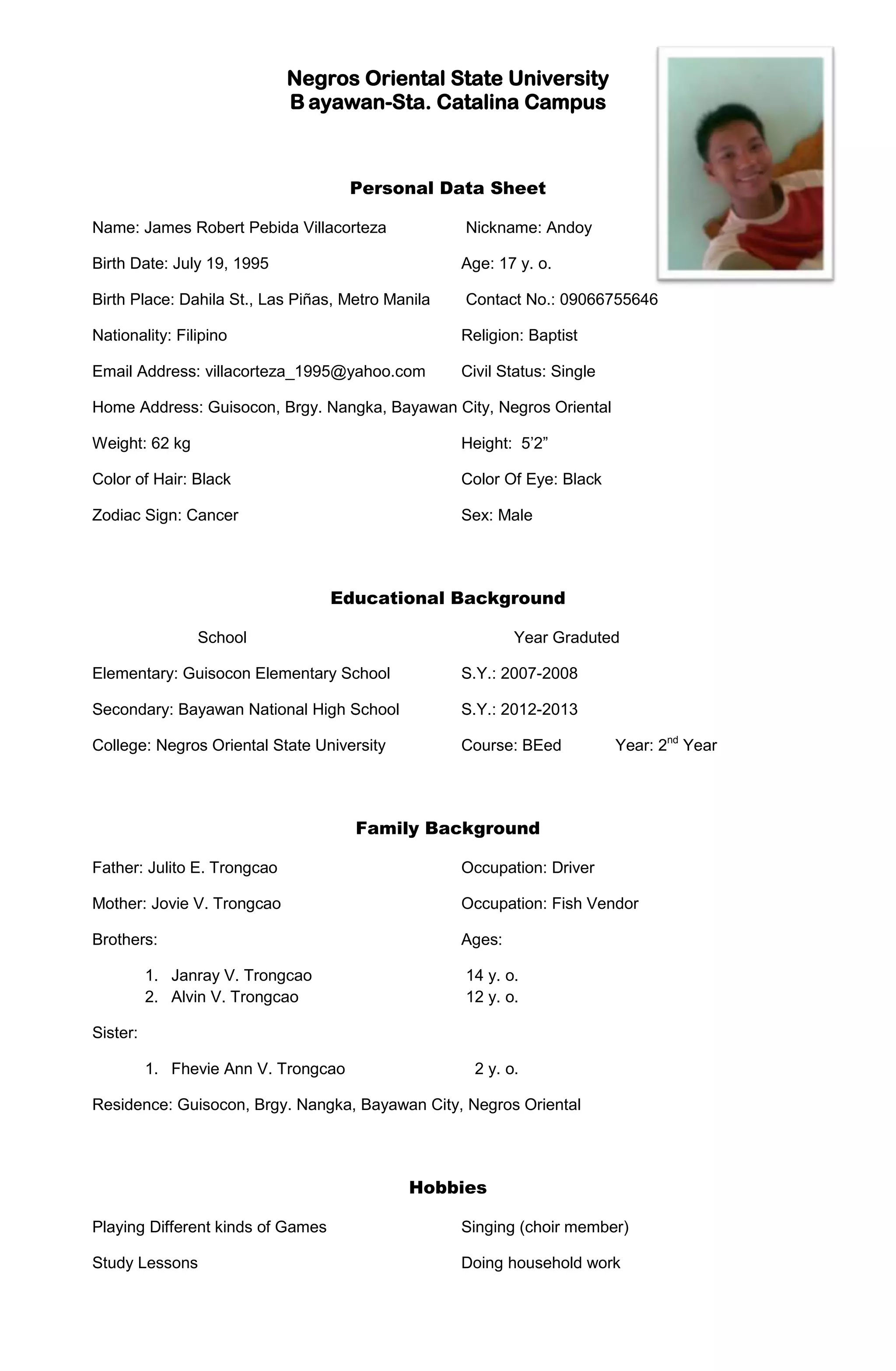 This personal data sheet provides biographical information about James Robert Pebida Villacorteza. It includes his name, date of birth, contact information, education history, family background, hobbies, and the art program he is enrolled in. His family resides in Guisocon, Brgy. Nangka, Bayawan City, Negros Oriental. He is currently a second year student pursuing a Bachelor of Elementary Education degree at Negros Oriental State University.
