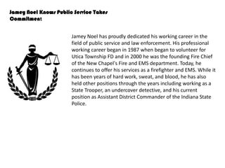 Jamey Noel is a dedicated law enforcement professional with a career spanning over three decades, beginning in 1987 as a volunteer firefighter and leading to his current role as assistant district commander of the Indiana State Police. He has received multiple awards for his service, including the Indiana State Police Life Saving Award and the Governor's Award for Valor, while also being politically active as chairman of the Clark County Republican Party. Noel has played a significant role in transforming Clark County's political landscape into a competitive two-party system.