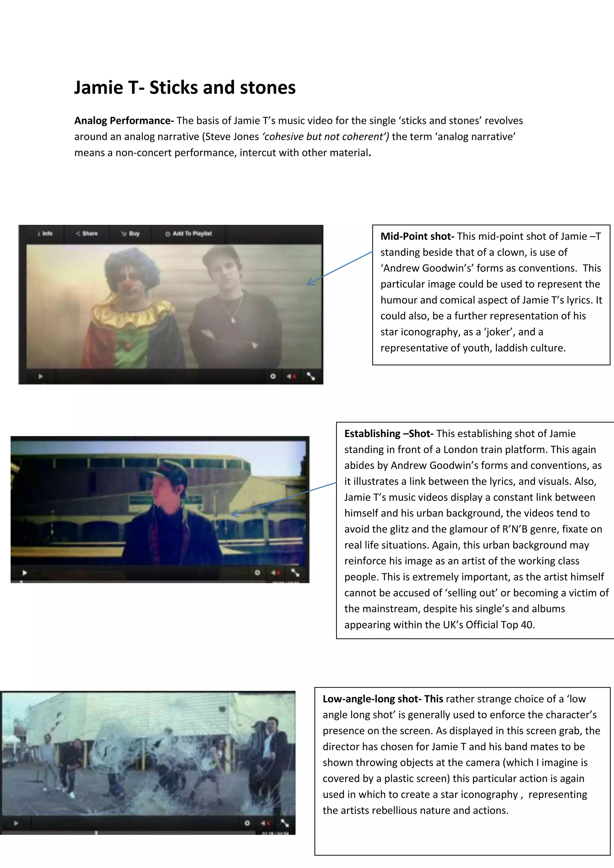 The music video for Jamie T's single "sticks and stones" uses an analog narrative structure with non-linear storytelling. A mid-point shot shows Jamie T standing beside a clown, representing the humor in his lyrics and his "joker" persona. An establishing shot shows Jamie T at a London train platform, linking the visuals to the lyrics and showing his urban background without glamorizing it. A low-angle long shot has Jamie T and his band throwing objects at the camera, reinforcing his rebellious nature as part of his public image.