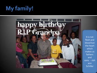 1) The document discusses the importance of family and how families are foundational units of society. It notes that families come in all shapes and sizes but ultimately it is the heart and love within a family that matters most.