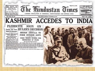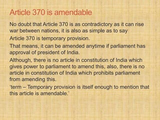 This document summarizes key aspects of Article 370 of the Indian constitution regarding the state of Jammu and Kashmir. It discusses the historical context for Article 370, including the accession of Jammu and Kashmir to India in 1947. It outlines the main provisions and special features of Article 370, such as Jammu and Kashmir having its own constitution and the limited applicability of parts of the Indian constitution to the state. The document also discusses the text of Article 370 and the autonomy it provides Jammu and Kashmir in certain matters compared to other Indian states.