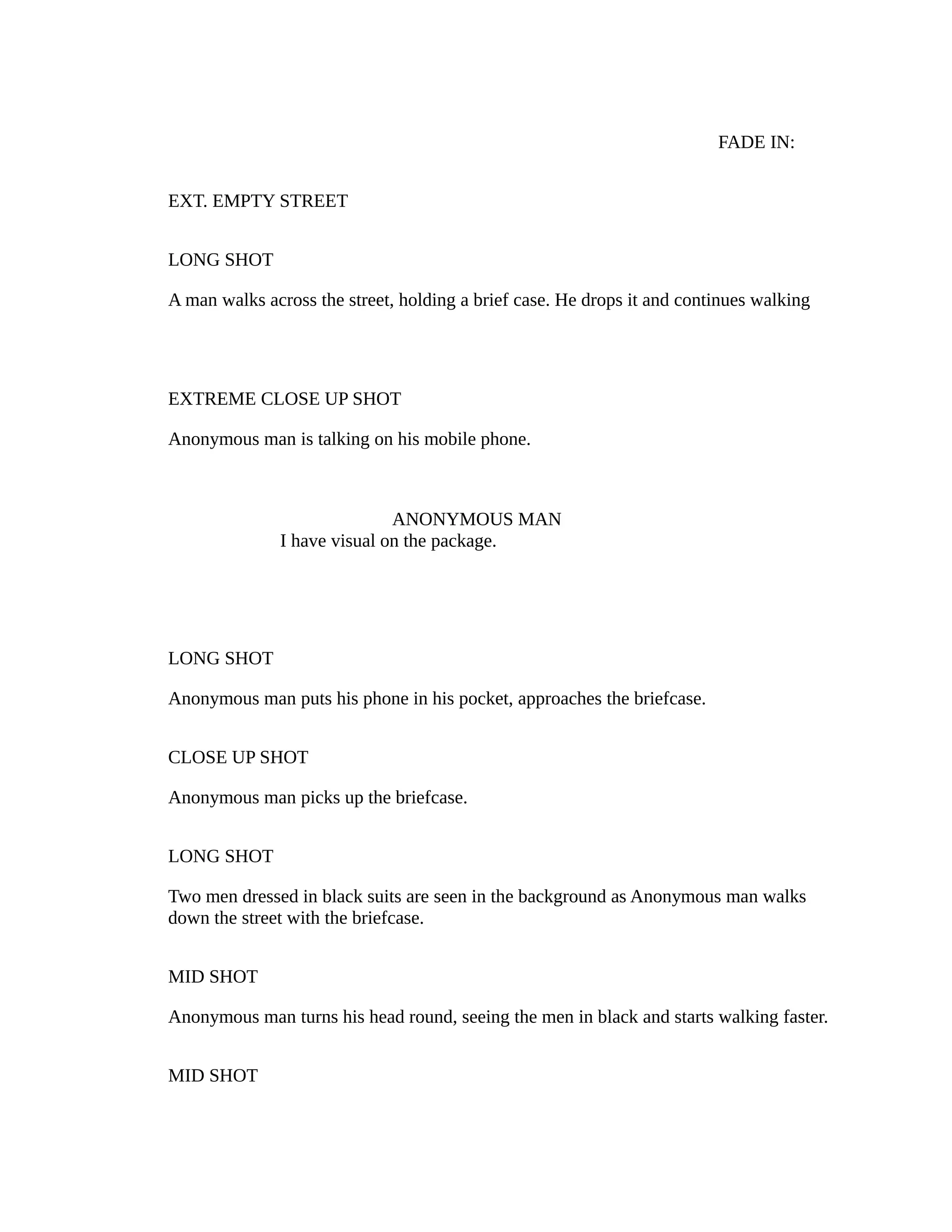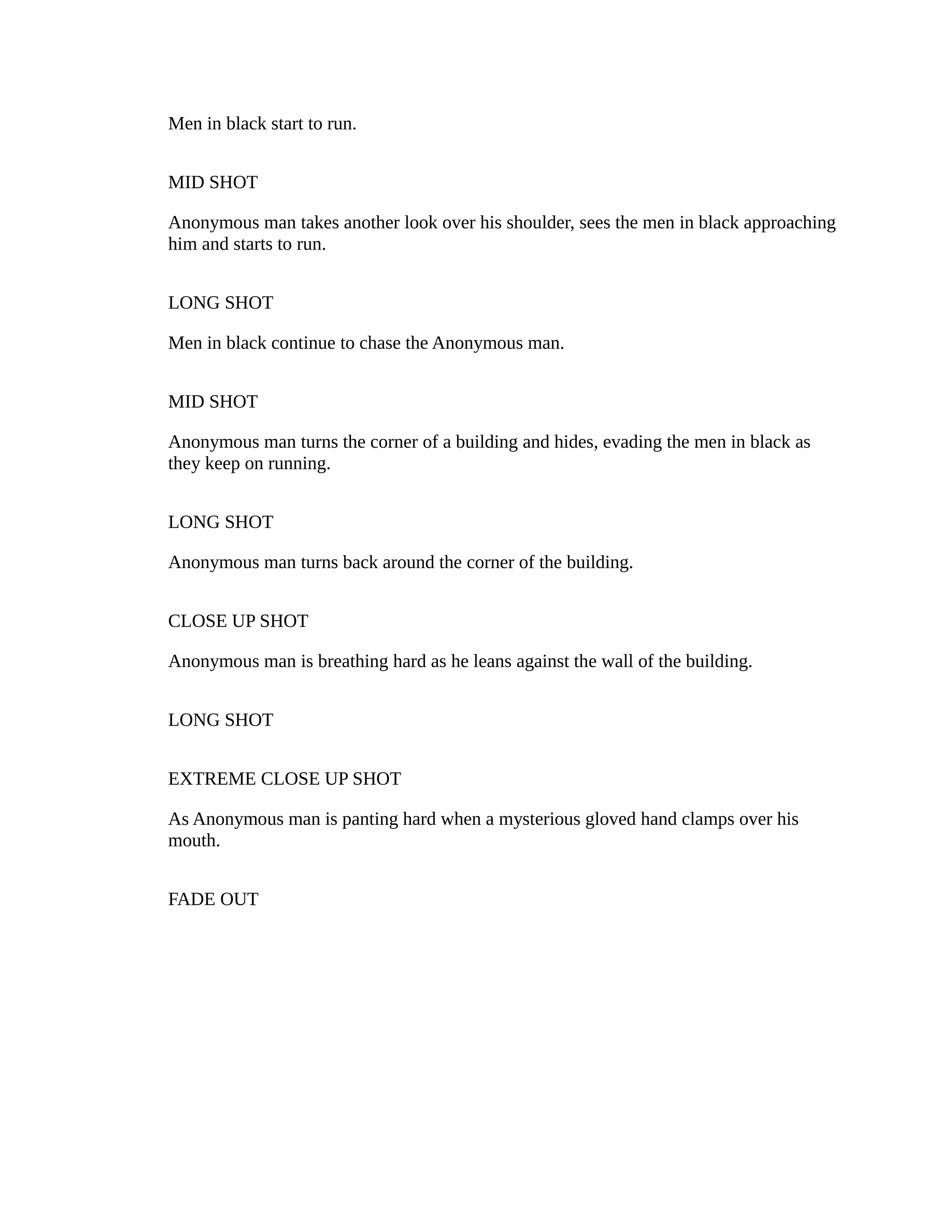A man drops a briefcase in the street and picks it up. He is being chased by two men in black suits who want the briefcase. The man evades the men by hiding around a corner but is then grabbed by another mysterious person in gloves behind the building.