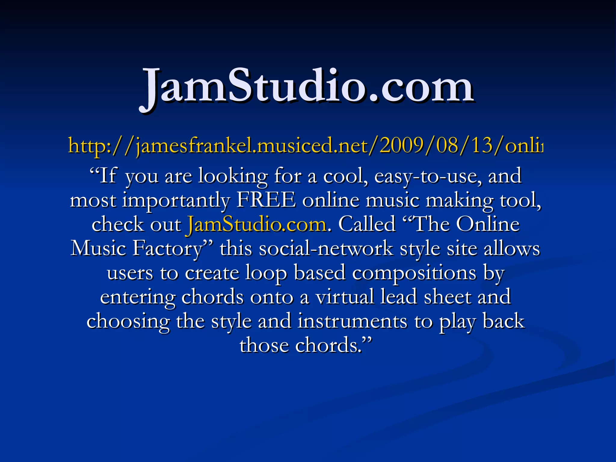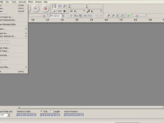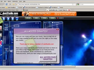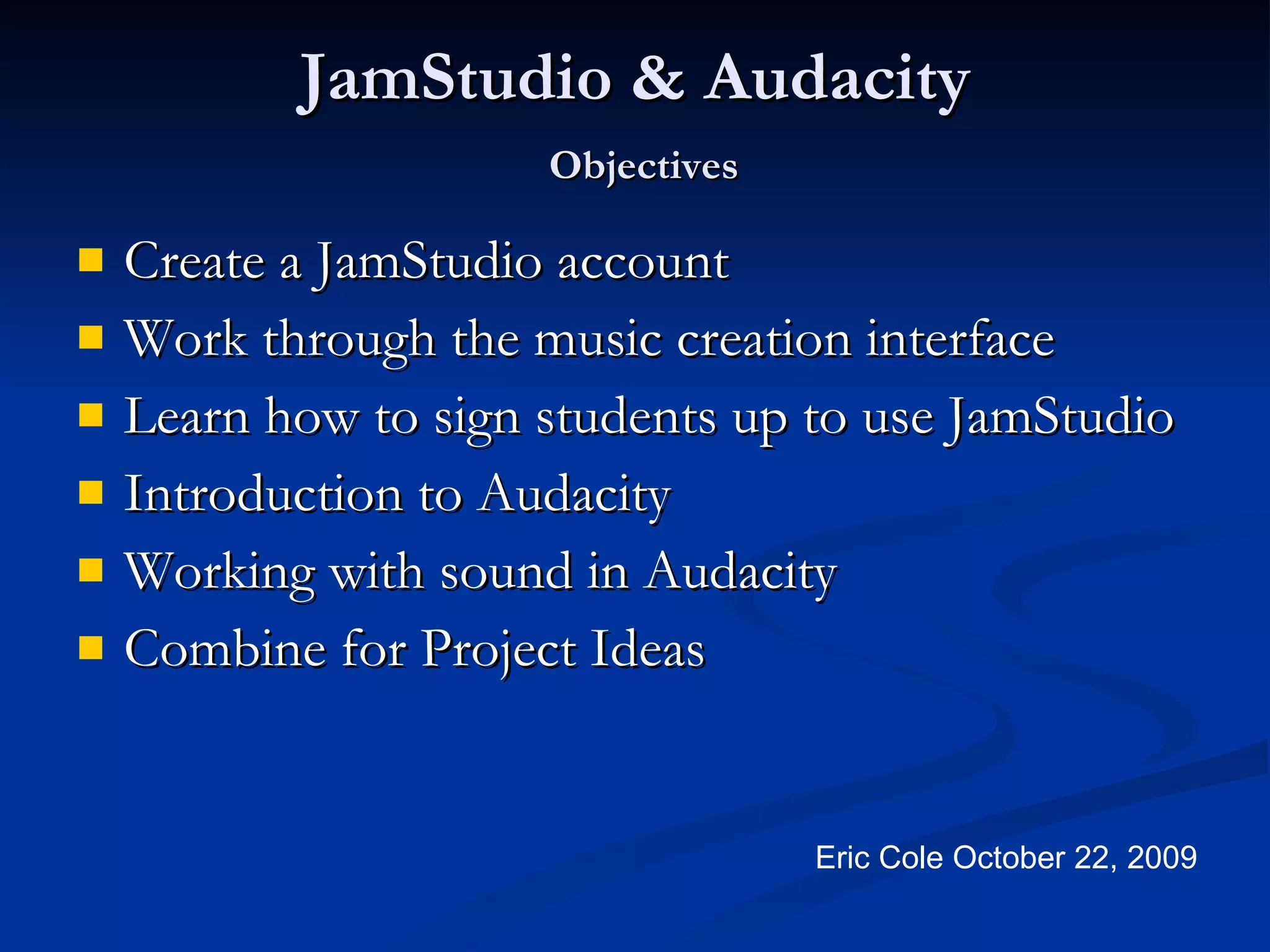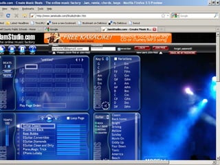 This document provides an introduction to the online music creation tool JamStudio and the audio editing software Audacity. It includes links to tutorials and guides for using each program. It also provides an example project from a student that combined JamStudio, Audacity and Windows Movie Maker to create a multimedia composition.