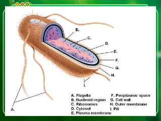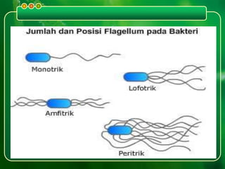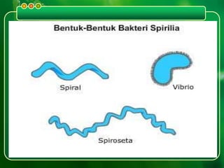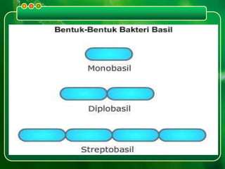 Dokumen ini menjelaskan morfologi dan bentuk bakteri, termasuk klasifikasi berdasarkan bentuk seperti basil, kokus, dan spiril. Selain itu, dikemukakan cara gerak bakteri, kebutuhan nutrisi, serta faktor-faktor yang mempengaruhi pertumbuhan mereka. Penjelasan juga mencakup peranan bakteri yang menguntungkan dan merugikan bagi manusia dan lingkungan.