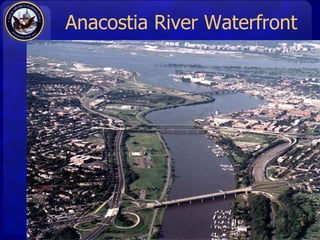The document discusses local development plans for the Anacostia River waterfront area in January 2010, including renovations to the 11th Street bridges, construction of The Yards Park, plans for a streetcar and parking programs, and early planning for sites like St. Elizabeth's and the Anacostia Naval Annex. It provides contact information for any questions about the development projects.