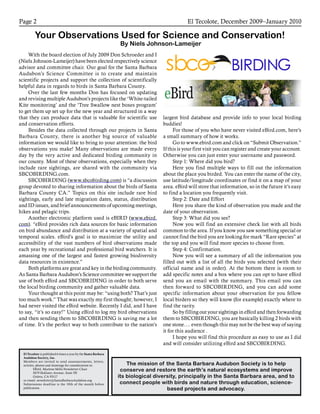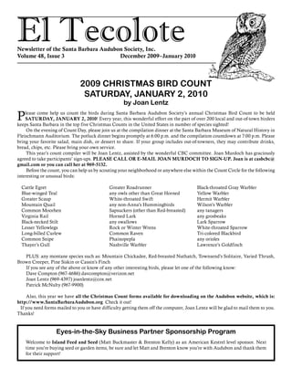 The document announces the Santa Barbara Audubon Society's annual Christmas Bird Count to be held on January 2, 2010. It encourages volunteers to help count birds and notes that the count keeps Santa Barbara in the top five counts in the US for number of species sighted. It provides details about signing up and the compilation dinner afterwards. It lists species of interest to report and contact information for the count compiler and others involved. It also announces upcoming volunteer opportunities to help improve habitat at Lake Los Carneros and previews upcoming Audubon programs.