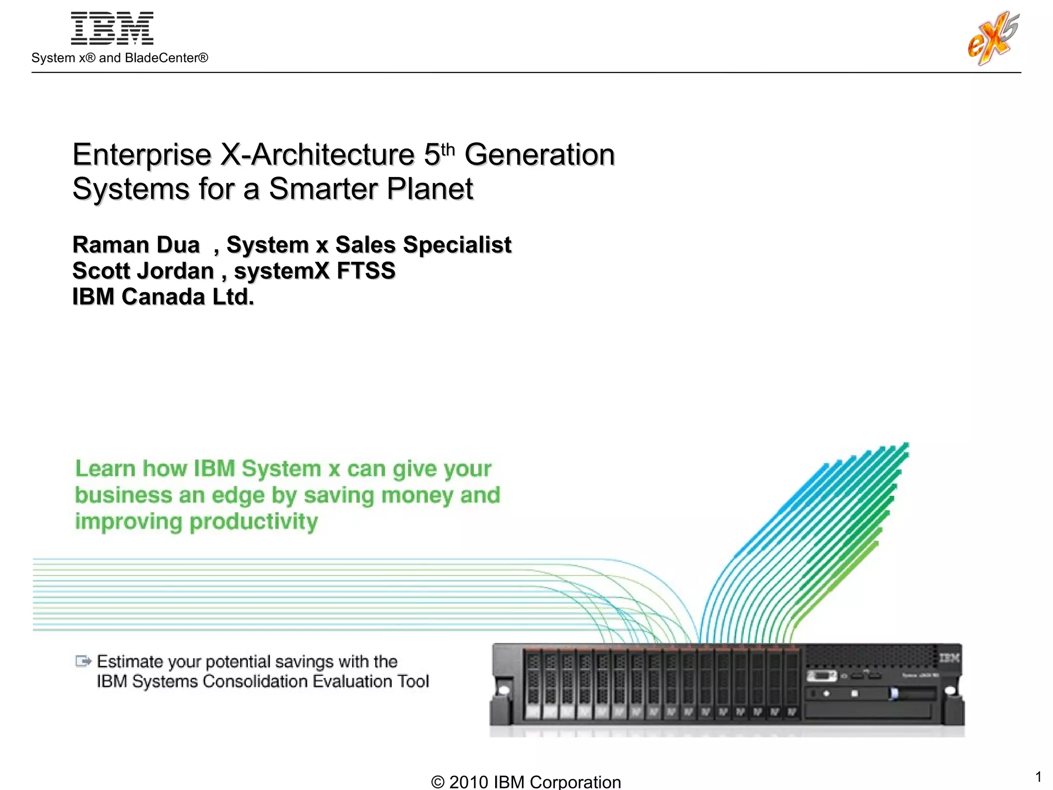 The document discusses IBM's acquisition of Blade Network Technologies and how it will help IBM provide improved networking solutions as part of their systems portfolio. It then provides an overview of IBM's eX5 rack mountable server and blade server systems, highlighting their performance, scalability, and suitability for different workloads. Specific blade and rack server models are described and positioning is discussed.