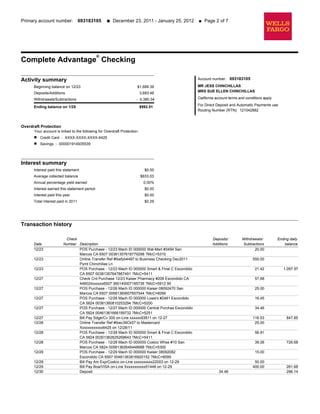 This document is a bank statement for Mr. and Mrs. Chinchillas for the period of December 23, 2011 through January 25, 2012. It shows a beginning balance of $1,689.39, deposits of $3,683.46, withdrawals of $4,380.34, leaving an ending balance of $992.51. It also lists transaction histories for their checking and savings accounts during this period.