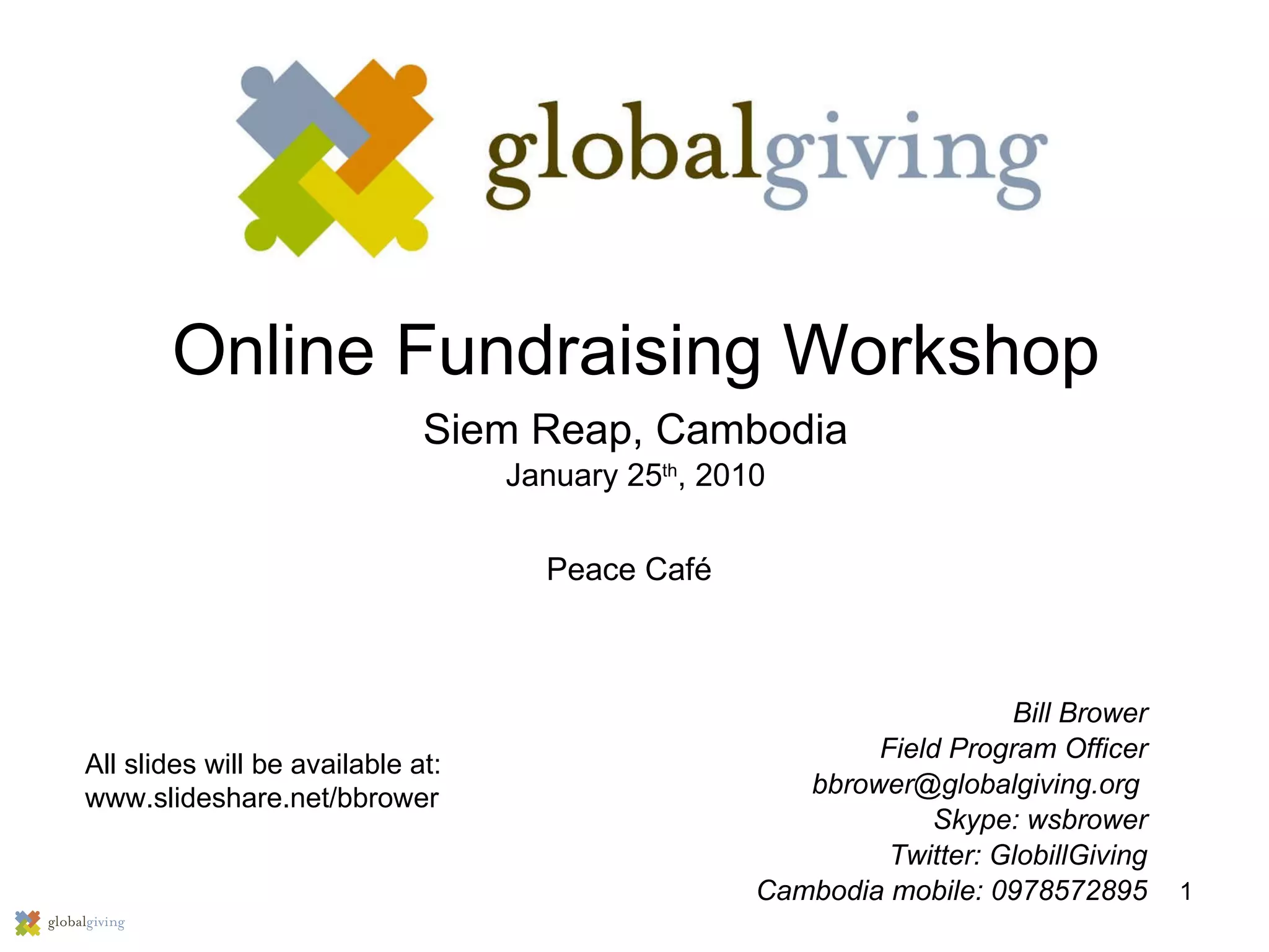 The document provides information about an online fundraising workshop in Siem Reap, Cambodia hosted by GlobalGiving. It discusses what GlobalGiving is, which is an online marketplace that connects donors to vetted charitable projects. It allows individuals and non-profits to directly communicate and receive donations. The document also outlines GlobalGiving's tools for online fundraising, promoting projects, and communicating with donors.