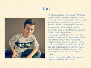 Jan is a 13-year-old boy who lives in Luboń, Poland with his parents Piotr and Aneta, who own two drugstores, his older sister Karolina, and two cats. He enjoys playing football, has training every day, and hopes to become a professional footballer like his favorite player Robert Lewandowski. In his free time, he spends time with his best friend Hubert or practices speaking English.
