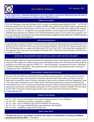 This weekly newsletter from the Navy Personnel Command provides information to sailors on career progression resources, education benefits, transition assistance events, and historical naval facts. Specifically, it outlines support available for sailors transitioning through the Enlisted Retention Board (ERB) or Perform to Serve (PTS) programs, such as career counseling and childcare benefits. It also details how official transcripts from virtual education are processed and placed in personnel files. Finally, it encourages sailors facing separation to attend transition assistance events for career and employment resources.