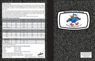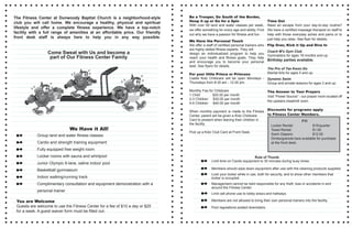The Fitness Center at Dunwoody Baptist Church offers monthly or annual memberships with discounted rates for families. Memberships include access to group fitness classes, cardio and weight equipment, an indoor pool, and childcare. Amenities include personal training, massage therapy, and a prayer room. Membership rates are subject to change and a two-week notice is required to cancel.