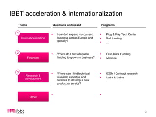 This document summarizes several programs to help companies with acceleration, internationalization, financing, and research & development. It describes the Plug & Play Tech Center program to help companies spend up to 3 months in Silicon Valley. It also details the EBN Soft Landing program network of incubators across 22 countries that provides short-term business support. Additionally, it outlines the Fast-Track Funding program to help young companies obtain early-stage funding through coaching and showcasing opportunities. Finally, it mentions leveraging IBBT's research expertise through programs like iLab.t and iLab.o to support SME R&D needs.