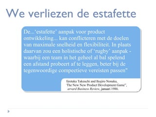 daarvan zou een holistische of ‘rugby’ aanpak waarbij een team in het geheel al bal spelend