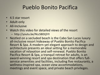 The document describes two all-inclusive resort options in Cabo San Lucas, Mexico. Option One is the Pueblo Bonito Pacifica resort, which is adult-only and features two pools, miles of private beach, spa services, and access to restaurants and amenities at three other nearby Pueblo Bonito properties. Option Two is the Fiesta Americana Grande Los Cabos resort, which is family-friendly and features five pools, a golf course, nightly entertainment, and seven restaurants serving cuisines from around the world. Both resorts offer an all-inclusive experience with meals, drinks, activities and facilities included in the room rate.
