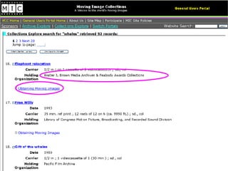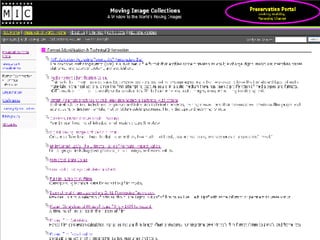 The document discusses the Moving Image Collections (MIC) project which aims to create a union catalog and provide access to moving image collections held by various organizations. The MIC project grew out of national plans to preserve film and television in the US. It will provide a central portal with a union catalog of metadata records harvested from participating institutions. The metadata will be mapped to various standards like MPEG-7 and Dublin Core to make the collections more accessible. The project is developing cataloging and mapping utilities to help diverse institutions participate and expose their materials.