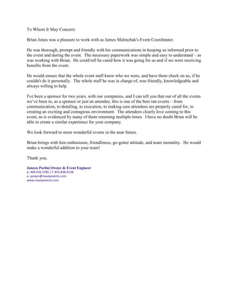 Brian Jones was praised for his work as an event coordinator. The letter writer said Brian ensured effective communication before and during events, made paperwork simple, and cared that attendees and sponsors were well taken care of. Staff under Brian's leadership were described as friendly, knowledgeable, and always willing to help. The letter writer stated this was one of the best run events they had attended due to Brian's leadership in communication, planning, and execution to create an exciting environment where attendees felt cared for. The letter writer recommended Brian highly for his enthusiasm, friendliness, and team-oriented approach.