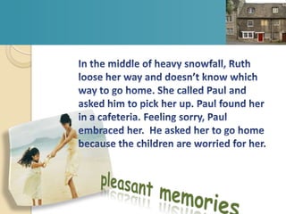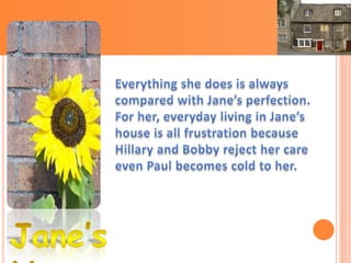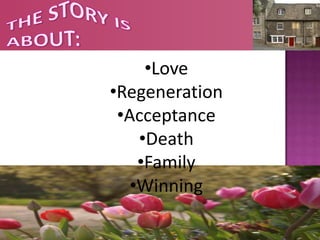 The document discusses the themes of love, regeneration, acceptance, death, and family. It introduces the main characters of Paul Klein, Ruth Golden, and Hillary Klein. It provides inspirational quotes from Paul about dealing with the difficulties of life and smiling when all else fails. It also shares a quote from Phyllis about the challenges of being close to someone with high standards. Ruth is quoted emphasizing doing your best and not worrying about outcomes, and a lesson about accepting life and living in the present rather than the past.