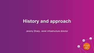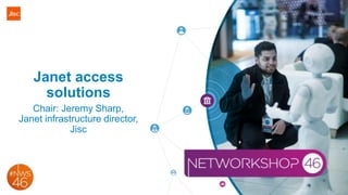The document outlines the current and future plans for the JANET access infrastructure in the UK, led by Jeremy Sharp, emphasizing the need for standardization and complexity reduction. It discusses procurement strategies, equipment options, and regulatory challenges facing the telecommunications industry, including dark fiber and openreach products. Future developments aim to enhance scalability and automation while improving network performance and management capabilities.