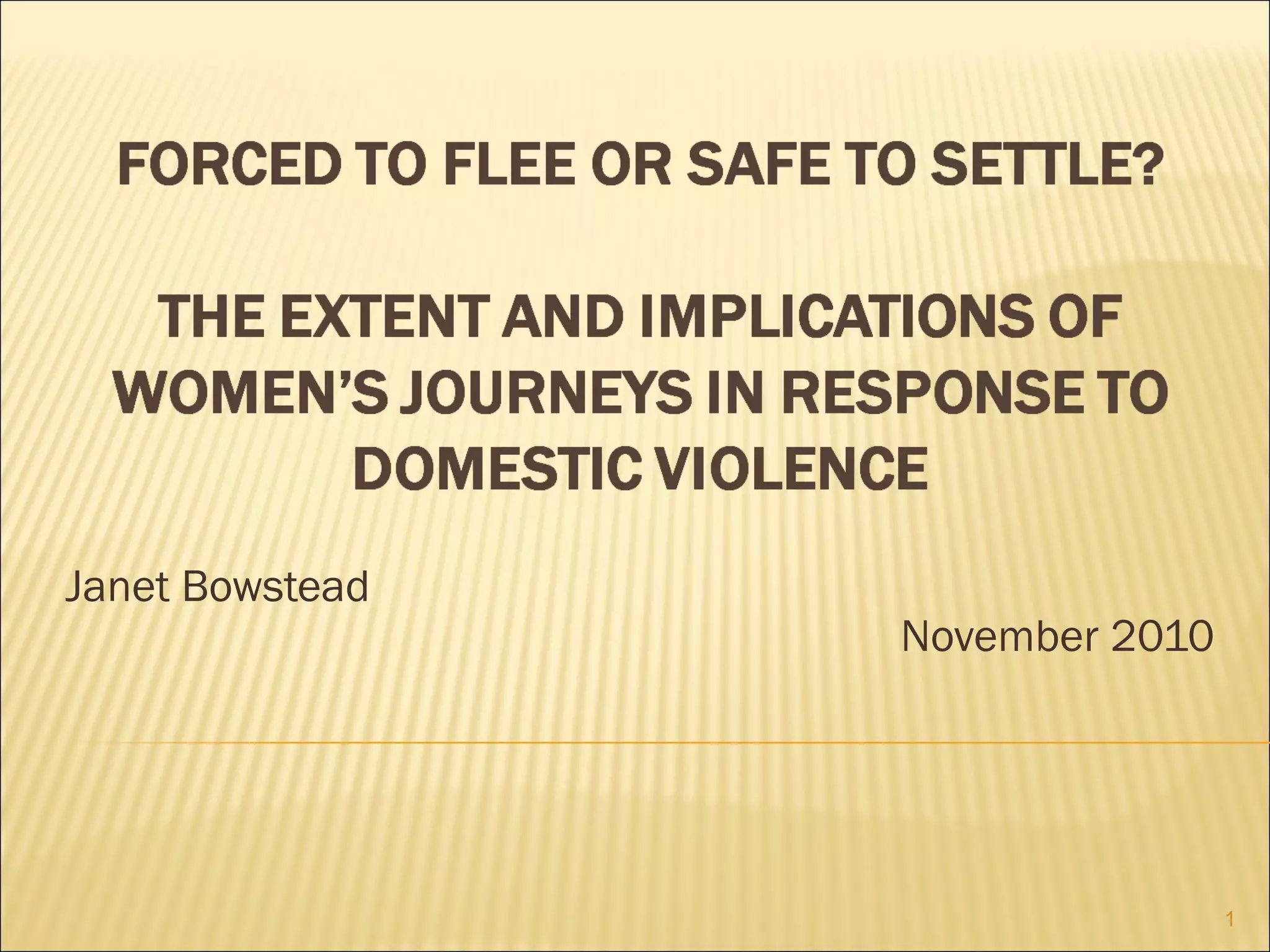 This document outlines Janet Bowstead's PhD research project which will map and analyze the relocation journeys of women experiencing domestic violence in England. It will interview women about their experiences of relocation and resettlement. The research also explores conceptualizing women's journeys using tools from other disciplines like Foucault's concepts of surveillance and panopticism, Deleuze and Guattari's idea of rhizomatic lines of flight, and Augé's notion of non-places. These concepts provide insights into understanding women's strategies for fleeing abuse by overcoming spatial constraints, escaping along unpredictable routes, and how refuges can counteract tendencies to be unlocated non-places.