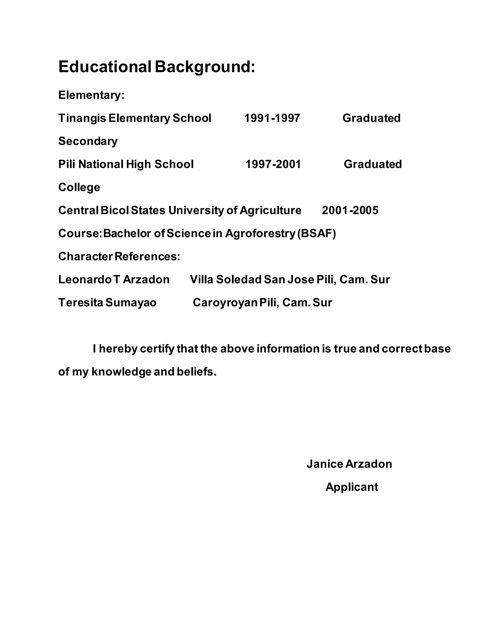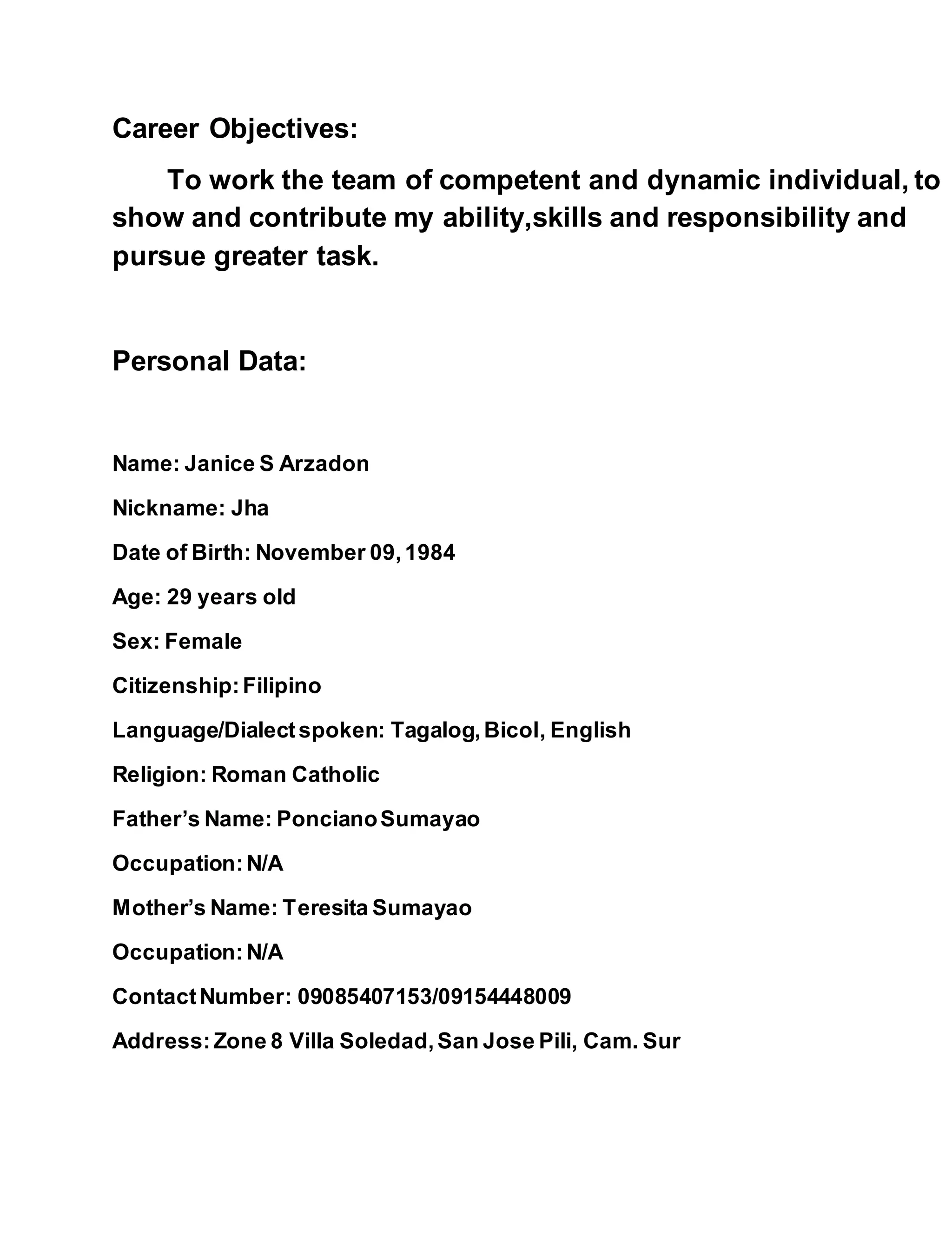 Janice Arzadon is a 29-year-old Filipino woman seeking to contribute her skills and abilities to a competent team while pursuing greater responsibilities. She completed her primary and secondary education in Camarines Sur, Philippines, and earned a Bachelor's degree in Agroforestry from Central Bicol State University of Agriculture in 2005. Her references are Leonardo Arzadon and Teresita Sumayao, both from Camarines Sur.