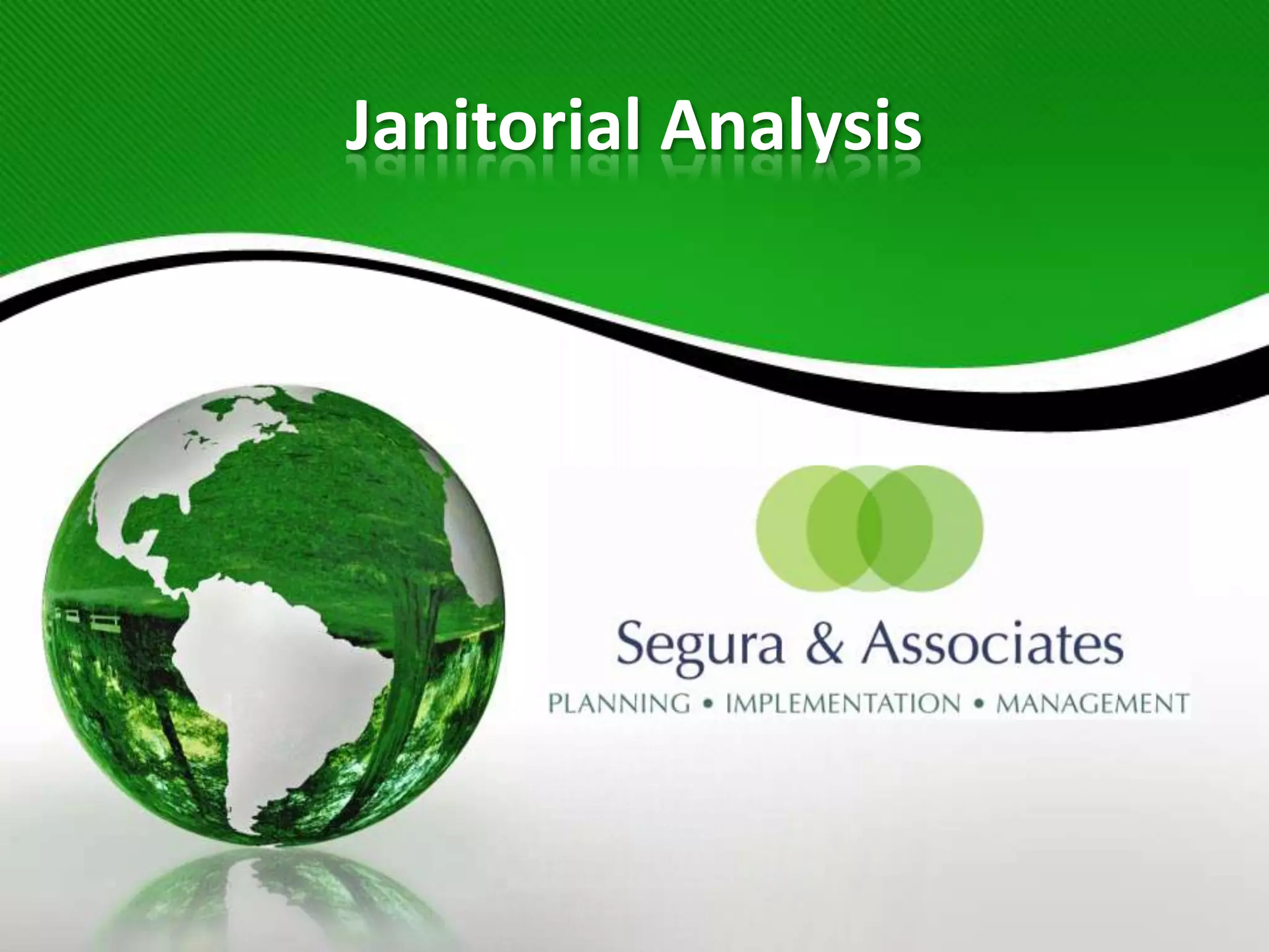 The document outlines an analysis of a janitorial company's operations that is segmented into six areas: management, operations, training, sustainable cleaning, custodial effectiveness assessment, and the CIMS six pillars benchmark. The analysis examines factors such as quality systems, health and safety stewardship, service delivery, management commitment, contract compliance, and training programs to evaluate operational efficiency and identify areas for improvement.