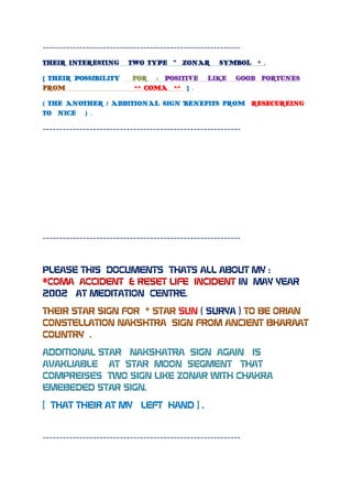 3. The document also describes the author's own experience with astrological signs, noting signs related to coma recovery and resetting of life, including signs related to the sun and an additional nakshatra sign on the moon.