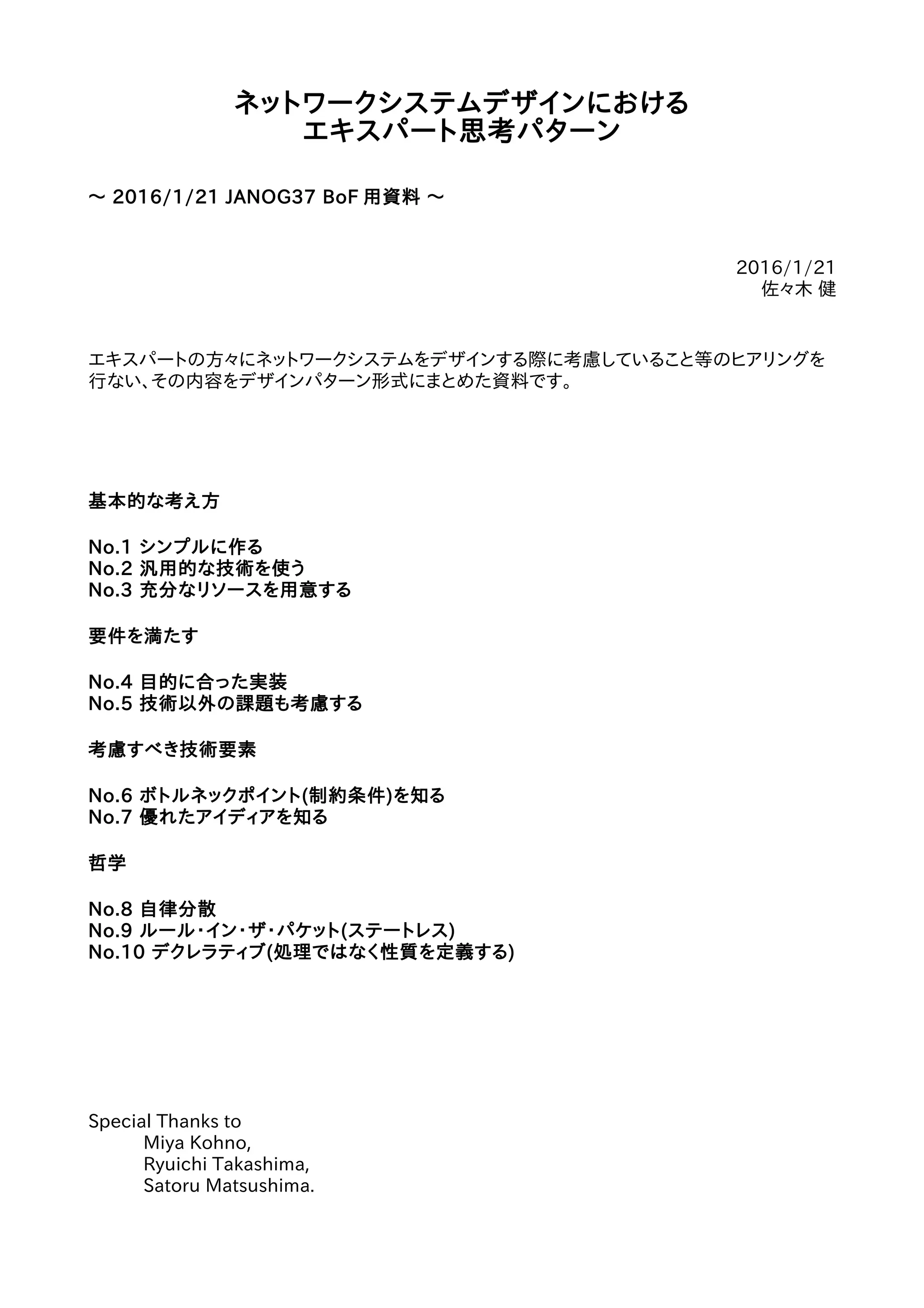 BoF 用資料 〜 2016/1/21 佐々木 健 エキスパートの方々にネットワークシステムをデザインする際に考慮していること等のヒアリングを 行ない、その内容をデザインパターン形式にまとめた資料です。 基本的な考え方 No.1 シンプルに作る No.2 汎用的な技術を使う No.3 充分なリソースを用意する 要件を満たす No.4 目的に合った実装 No.5 技術以外の課題も考慮する 考慮すべき技術要素 No.6 ボトルネックポイント(制約条件)を知る No.7 優れたアイディアを知る 哲学 No.8 自律分散 No.9 ルール・イン・ザ・パケット(ステートレス) No.10 デクレラティブ(処理ではなく性質を定義する) Special Thanks to Miya Kohno, Ryuichi Takashima, Satoru Matsushima.