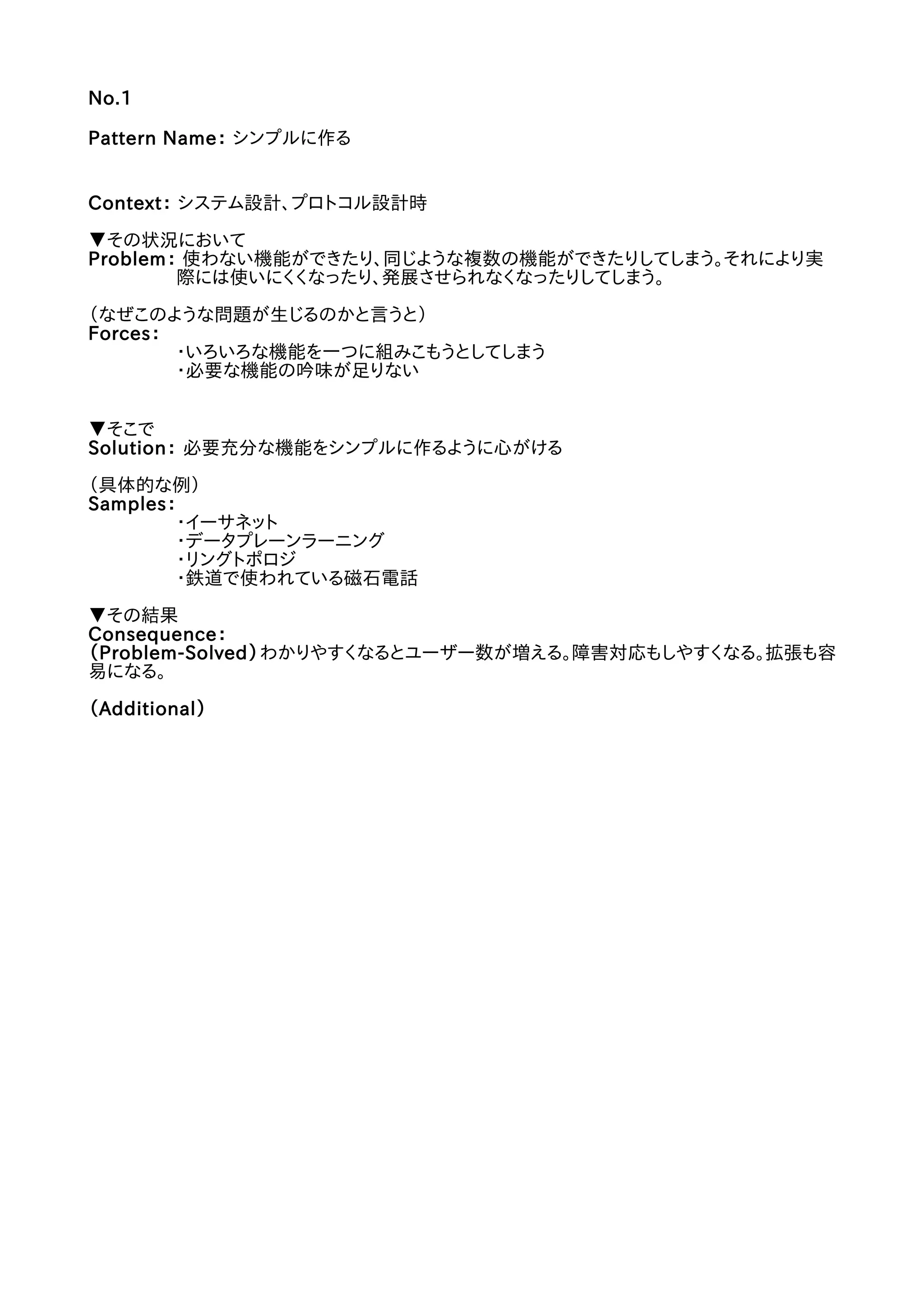 システム設計、プロトコル設計時 ▼その状況において Problem: 使わない機能ができたり、同じような複数の機能ができたりしてしまう。それにより実 際には使いにくくなったり、発展させられなくなったりしてしまう。 (なぜこのような問題が生じるのかと言うと) Forces: ・いろいろな機能を一つに組みこもうとしてしまう ・必要な機能の吟味が足りない ▼そこで Solution: 必要充分な機能をシンプルに作るように心がける (具体的な例) Samples: ・イーサネット ・データプレーンラーニング ・リングトポロジ ・鉄道で使われている磁石電話 ▼その結果 Consequence: (Problem-Solved)わかりやすくなるとユーザー数が増える。障害対応もしやすくなる。拡張も容 易になる。 (Additional)