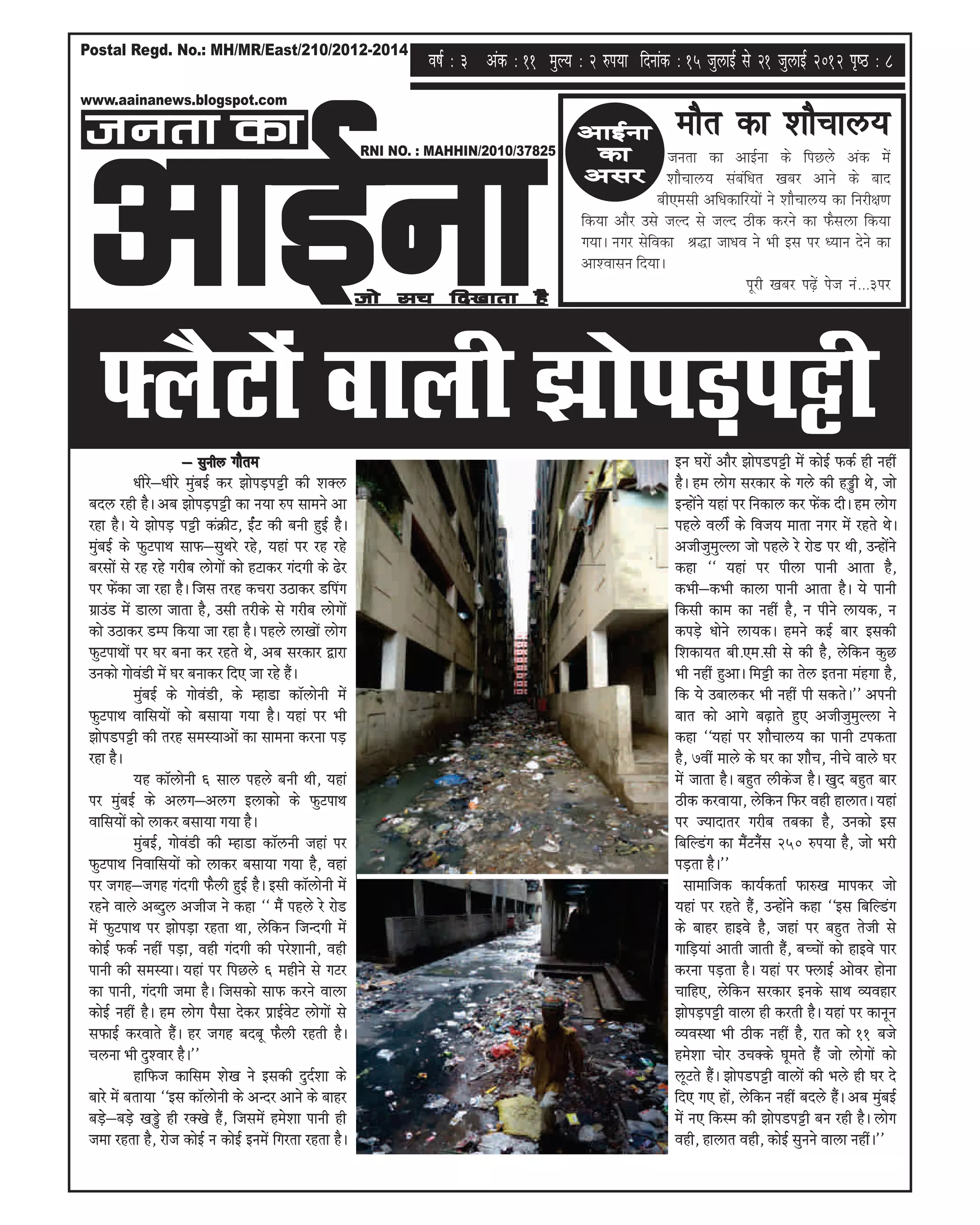 MH/MR/East/210/2012-2014 o”kZ % 3 vad % 11 eqY; % 2 #i;k fnukad % 15 tqykbZ ls 21 tqykbZ 2012 i`”B % 8 vkbZuk www.aainanews.blogspot.com turk dk RNI NO. : MAHHIN/2010/37825 vkbZuk dk ekSr dk ‘kkSpky; turk dk vkbZuk ds fiNys vad esa vlj ‘kkSpky; lacaf/kr [kcj vkus ds ckn ch,elh vf/kdkfj;ksa us ‘kkSpky; dk fujh{k.k fd;k vkSj mls tYn ls tYn Bhd djus dk QSlyk fd;k x;kA uxj lsfodk J)k tk/ko us Hkh bl ij /;ku nsus dk vk’oklu fn;kA iwjh [kcj i<+sa ist ua---3ij tks lp fn[kkrk gS ¶ySVksa okyh >ksiM+iêh & lquhy xkSre bu ?kjksa vkSj >ksiMiêh esa dksbZ QdZ gh ugha /khjs&/khjs eqacbZ dj >ksiM+iêh dh 'kDy gSA ge yksx ljdkj ds xys dh gìh Fks] tks cny jgh gSA vc >ksiM+iêh dk u;k #i lkeus vk bUgksaus ;gka ij fudky dj Qsad nhA ge yksx jgk gSA ;s >ksiM+ iêh daØhV] bZaV dh cuh gqbZ gSA igys oyhZ ds fot; ekrk uxj esa jgrs FksA eqacbZ ds QqVikFk lkQ&lqFkjs jgs] ;gka ij jg jgs vthtqeqYyk tks igys js jksM ij Fkh] mUgksaus cjlksa ls jg jgs xjhc yksxksa dks gVkdj xanxh ds <sj dgk ^^ ;gka ij ihyk ikuh vkrk gS] ij Qsadk tk jgk gSA ftl rjg dpjk mBkdj Mfiax dHkh&dHkh dkyk ikuh vkrk gSA ;s ikuh xzkmaM esa Mkyk tkrk gS] mlh rjhds ls xjhc yksxksa fdlh dke dk ugha gS] u ihus yk;d] u dks mBkdj MEi fd;k tk jgk gSA igys yk[kksa yksx diM+s /kksus yk;dA geus dbZ ckj bldh QqVikFkksa ij ?kj cuk dj jgrs Fks] vc ljdkj }kjk f'kdk;r ch-,e-lh ls dh gS] ysfdu dqN mudks xksoaMh esa ?kj cukdj fn, tk jgs gSaA Hkh ugha gqvkA feêh dk rsy bruk eagxk gS] eqacbZ ds xksoaMh] ds EgkMk dkWyksuh esa fd ;s mckydj Hkh ugha ih ldrsA** viuh QqVikFk okfl;ksa dks clk;k x;k gSA ;gka ij Hkh ckr dks vkxs c<+krs gq, vthtqeqYyk us >ksiMiêh dh rjg leL;kvksa dk lkeuk djuk iM+ dgk ^^;gka ij 'kkSpky; dk ikuh Vidrk jgk gSA gS] 7oha ekys ds ?kj dk 'kkSp] uhps okys ?kj ;g dkWyksuh 6 lky igys cuh Fkh] ;gka esa tkrk gSA cgqr yhdst gSA [kqn cgqr ckj ij eqacbZ ds vyx&vyx bykdks ds QqVikFk Bhd djok;k] ysfdu fQj ogh gkykrA ;gka okfl;ksa dks ykdj clk;k x;k gSA ij T;knkrj xjhc rcdk gS] mudks bl eqacbZ] xksoaMh dh EgkMk dkWyuh tgka ij fcfYMax dk eSaVuSal 250 #i;k gS] tks Hkjh QqVikFk fuokfl;ksa dks ykdj clk;k x;k gS] ogka iM+rk gSA** ij txg&txg xanxh QSyh gqbZ gSA blh dkWyksuh esa lkekftd dk;ZdrkZ Qk#[k ekidj tks jgus okys vCnqy vtht us dgk ^^ eSa igys js jksM ;gka ij jgrs gSa] mUgksaus dgk ^^bl fcfYMax esa QqVikFk ij >ksiM+k jgrk Fkk] ysfdu ftUnxh esa ds ckgj gkbos gS] tgka ij cgqr rsth ls dksbZ QdZ ugha iM+k] ogh xanxh dh ijs'kkuh] ogh xkfM+;ka vkrh tkrh gSa] cPpksa dks gkbos ikj ikuh dh leL;kA ;gka ij fiNys 6 eghus ls xVj djuk iM+rk gSA ;gka ij ¶ykbZ vksoj gksuk dk ikuh] xanxh tek gSA ftldks lkQ djus okyk pkfg,] ysfdu ljdkj buds lkFk O;ogkj dksbZ ugha gSA ge yksx iSlk nsdj izkbZosV yksxksa ls >ksiM+iêh okyk gh djrh gSA ;gka ij dkuwu lQkbZ djokrs gSaA gj txg cncw QSyh jgrh gSA O;oLFkk Hkh Bhd ugha gS] jkr dks 11 cts pyuk Hkh nq'okj gSA** ges'kk pksj mpDds ?kwers gSa tks yksxksa dks gkfQt dkfle 'ks[k us bldh nqnZ'kk ds ywVrs gSaA >ksiMiêh okyksa dh Hkys gh ?kj ns ckjs esa crk;k ^^bl dkWyksuh ds vUnj vkus ds ckgj fn, x, gksa] ysfdu ugha cnys gSaA vc eqacbZ cM+s&cM+s [kìs gh jD[ks gSa] ftlesa ges'kk ikuh gh esa u, fdLe dh >ksiMiêh cu jgh gSA yksx tek jgrk gS] jkst dksbZ u dksbZ buesa fxjrk jgrk gSA ogh] gkykr ogh] dksbZ lquus okyk ughaA**