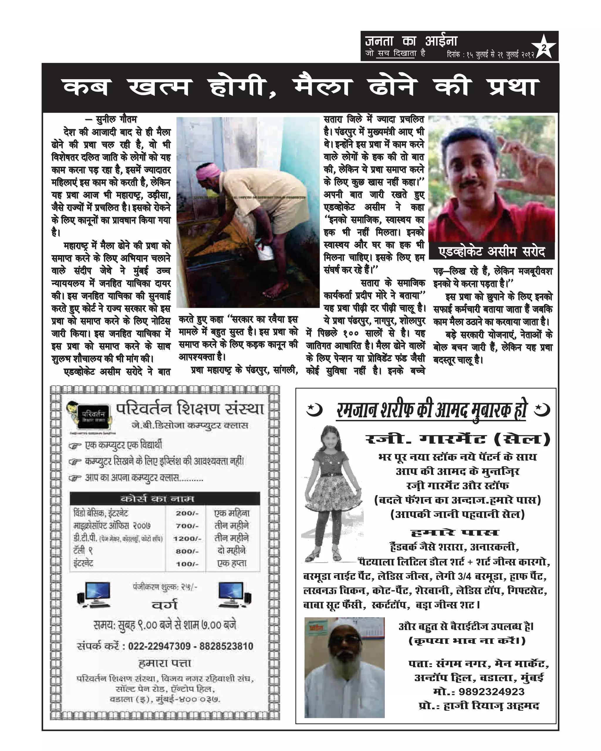 2 tks lp fn[kkrk gS fnukad % 15 tqykbZ ls 21 tqykbZ 2012 dc [kRe gksxh] eSyk <ksus dh izFkk & lquhy xkSre lrkjk ftys esa T;knk izpfyr ns'k dh vktknh ckn ls gh eSyk gSA ia<jiqj esa eq[;ea=h vk, Hkh <ksus dh izFkk py jgh gS] oks Hkh FksA bUgksaus bl izFkk esa dke djus fo'ks”krj nfyr tkfr ds yksxksa dks ;g okys yksxksa ds gd dh rks ckr dke djuk iM+ jgk gS] blesa T;knkrj dh] ysfdu ;s izFkk lekIr djus efgyk,a bl dke dks djrh gS] ysfdu ds fy, dqN [kkl ugha dgkA** ;g izFkk vkt Hkh egkjk”Vª] mM+hlk] viuh ckr tkjh j[krs gq, tSls jkT;ksa esa izpfyr gSA bldks jksdus ,MOgksdsV vlhe us dgk ds fy, dkuwuksa dk izko/kku fd;k x;k ^^budks lekftd] LokLFk; dk gSA gd Hkh ugha feyrkA budks egkjk”Vª esa eSyk <ksus dh izFkk dks LokLFk; vkSj ?kj dk gd Hkh lekIr djus ds fy, vfHk;ku pykus feyuk pkfg,A blds fy, ge ,MOgksdsV vlhe ljksn okys lanhi tsFks us eqacbZ mPp la?k”kZ dj jgs gSaA** i<+&fy[k jgs gSa] ysfdu etcwjho'k U;k;;y; esa tufgr ;kfpdk nk;j lrkjk ds lekftd budks ;s djuk iM+rk gSA** dhA bl tufgr ;kfpdk dh lquokbZ dk;ZdrkZ iznhi eksjs us crk;k** bl izFkk dks Nqikus ds fy, budks djrs gq, dksVZ us jkT; ljdkj dks bl ;g izFkk ih<+h nj ih<+h pkyw gSA lQkbZ deZpkjh crk;k tkrk gSa tcfd izFkk dks lekIr djus ds fy, uksfVl djrs gq, dgk ^^ljdkj dk joS;k bl ;s izFkk ia<jiqj] ukxiqj] 'kksykiqj dke eSyk mBkus dk djok;k tkrk gSA tkjh fd;kA bl tufgr ;kfpdk esa ekeys esa cgqr lqLr gSA bl izFkk dks esa fiNys 100 lkyksa ls gSA ;g cM+s ljdkjh ;kstuk,a] usrkvksa ds bl izFkk dks lekIr djus ds lkFk lekIr djus ds fy, dM+d dkuwu dh tkfrxr vk/kkfjr gSA eSyk <ksus okyksa cksy cpu tkjh gSa] ysfdu ;g izFkk 'kqyHk 'kkSpky; dh Hkh ekax dhA vki';Drk gSA ds fy, isU'ku ;k izksfoMsaV QaM tSlh cnLrwj pkyw gSA ,MOgksdsV vlhe ljksns us ckr izFkk egkjk”Vª ds ia<jiqj] lkaxyh] dksbZ lqfo/kk ugha gSA buds cPps