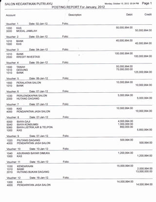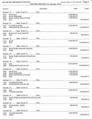 This document is a transaction report for a salon business called Salon Kecantikan Putri Ayu for the month of January 2012. It shows the debits and credits for various accounts of the business for voucher transactions from January 1-31. Major transactions include deposits of revenue into the cash account, payments of expenses from cash, and transfers between cash and bank accounts. The net changes and ending balances are provided for each account.