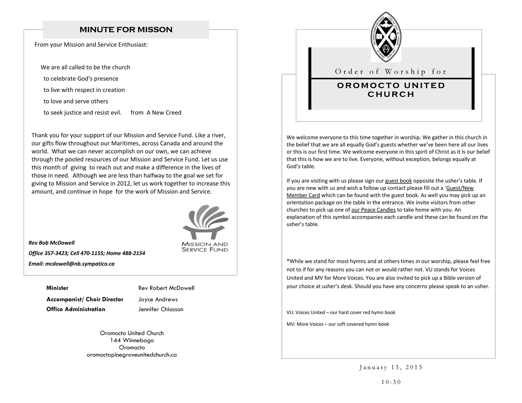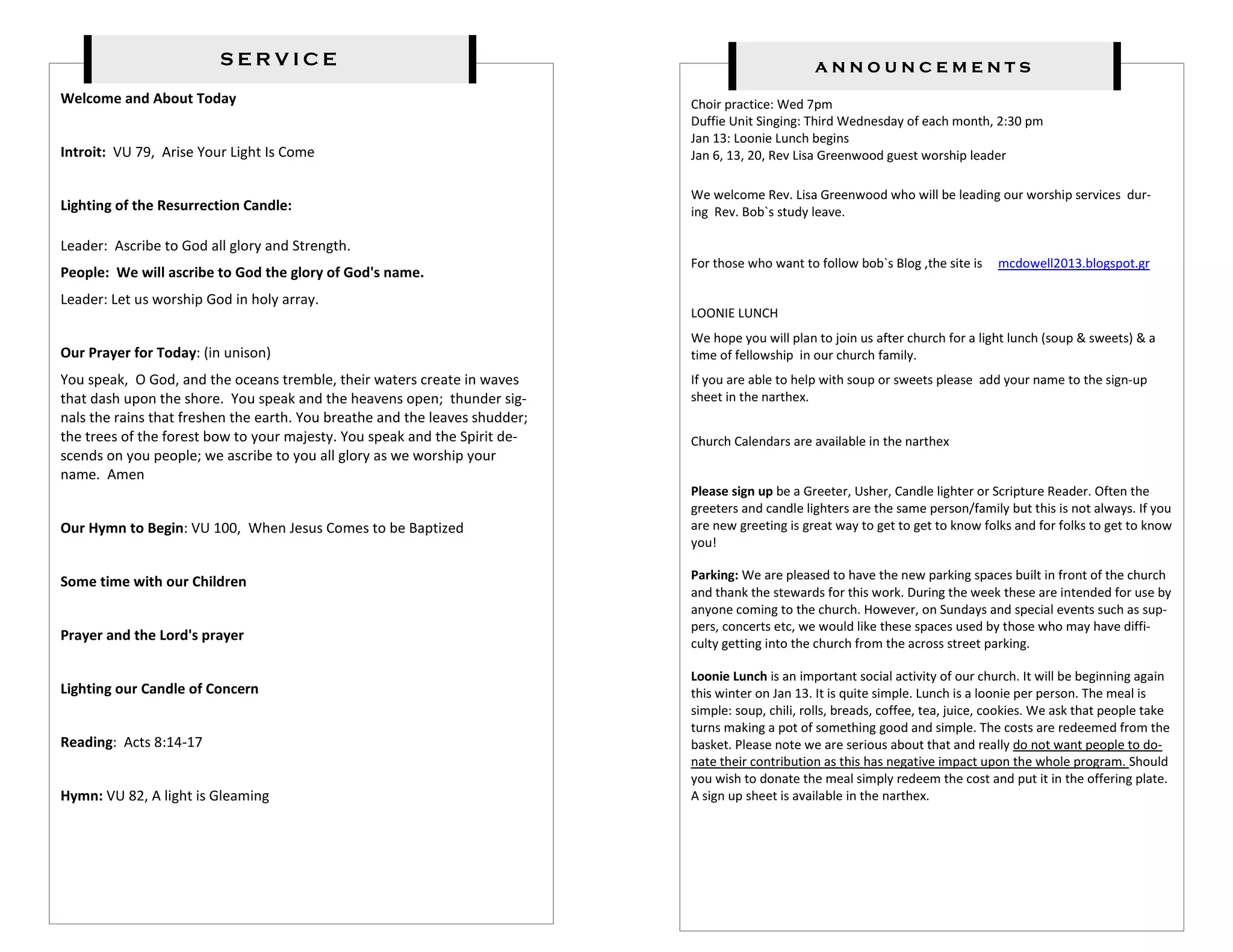 This document provides the order of worship and announcements for Oromocto United Church. The service will include hymns, prayers, a reading from Acts, a gospel reading from Luke, a message, offering, and prayers of concern. Announcements note that Rev. Lisa Greenwood will lead worship during Rev. Bob McDowell's study leave and invite people to sign up to help with greeting, ushering, candle lighting, scripture reading, and providing food for the Loonie Lunch following the service.
