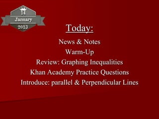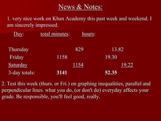 The document provides a daily schedule and notes for a math class that includes reviewing graphing inequalities, practicing related questions on Khan Academy, and an introduction to parallel and perpendicular lines. It shares the students' time spent on Khan Academy problems over the past week and notes there will be a test this week on graphing inequalities and parallel/perpendicular lines. Examples are given for finding the equations of parallel and perpendicular lines.