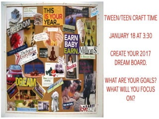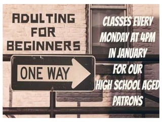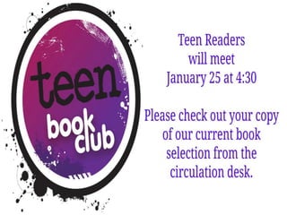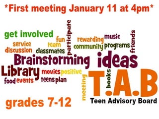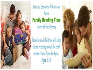 The document outlines the January programs and schedule for a public library. It lists the library's general hours, children's programs occurring on various weekdays and Fridays, tween and teen programs, and adult programs. It also provides information about the Board of Trustees' open meeting on January 23rd at 5:30pm, including rules that members of the public can listen but not participate unless they notify the Library Director in advance and limit their comments to two minutes.
