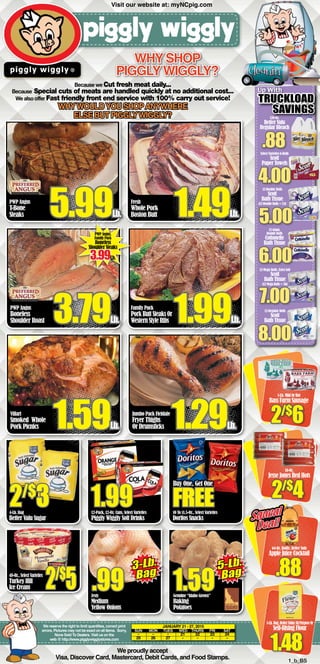 This document is a grocery store advertisement listing various food and household items on sale for the week of January 21-27, 2015 at Piggly Wiggly stores in Siler City and Pittsboro, North Carolina. It provides sale prices for a wide range of products including meats, produce, dairy, baked goods, canned goods, drinks, household essentials, and tobacco products. The ad encourages customers to shop at Piggly Wiggly for quality groceries and savings.