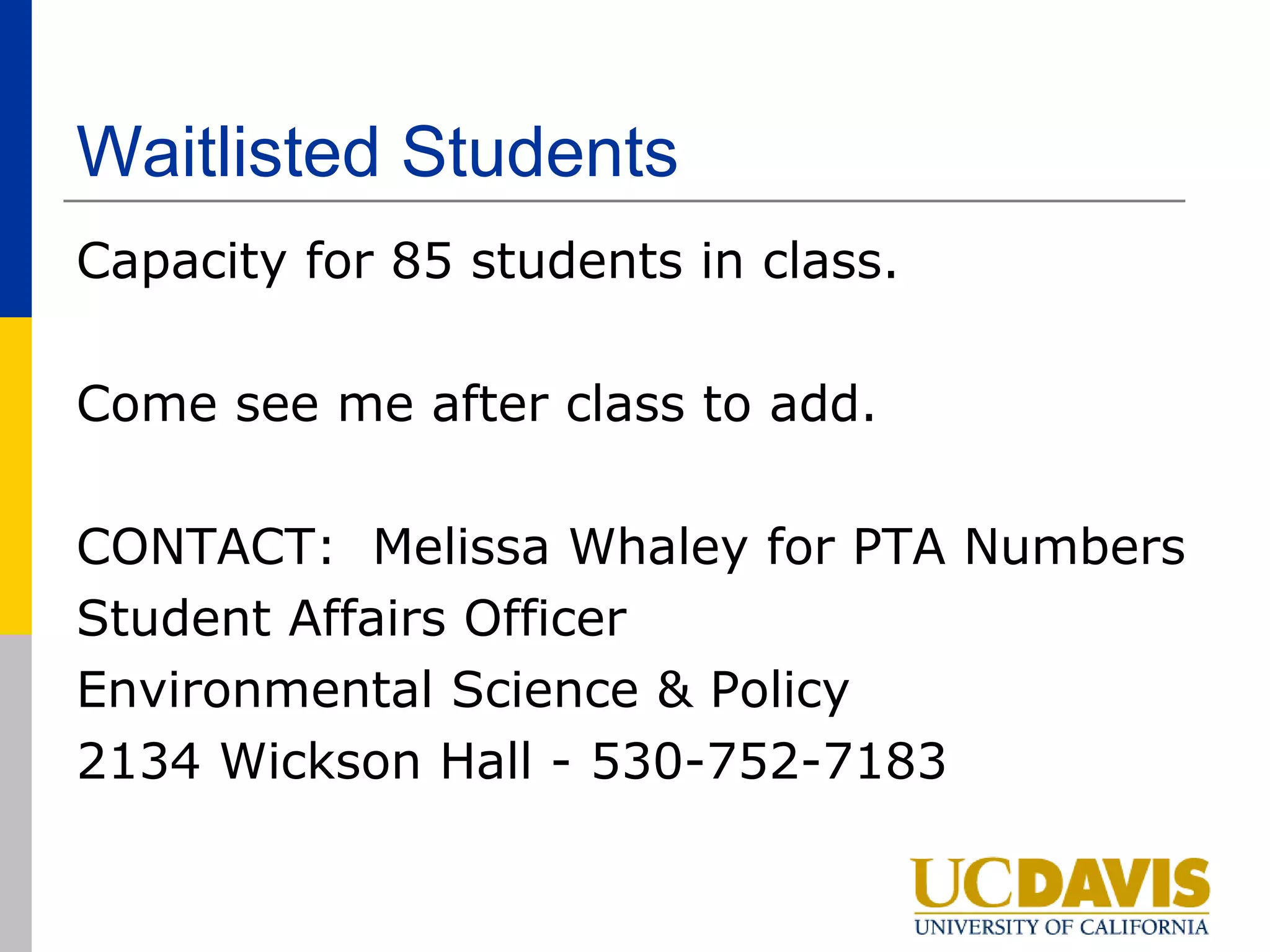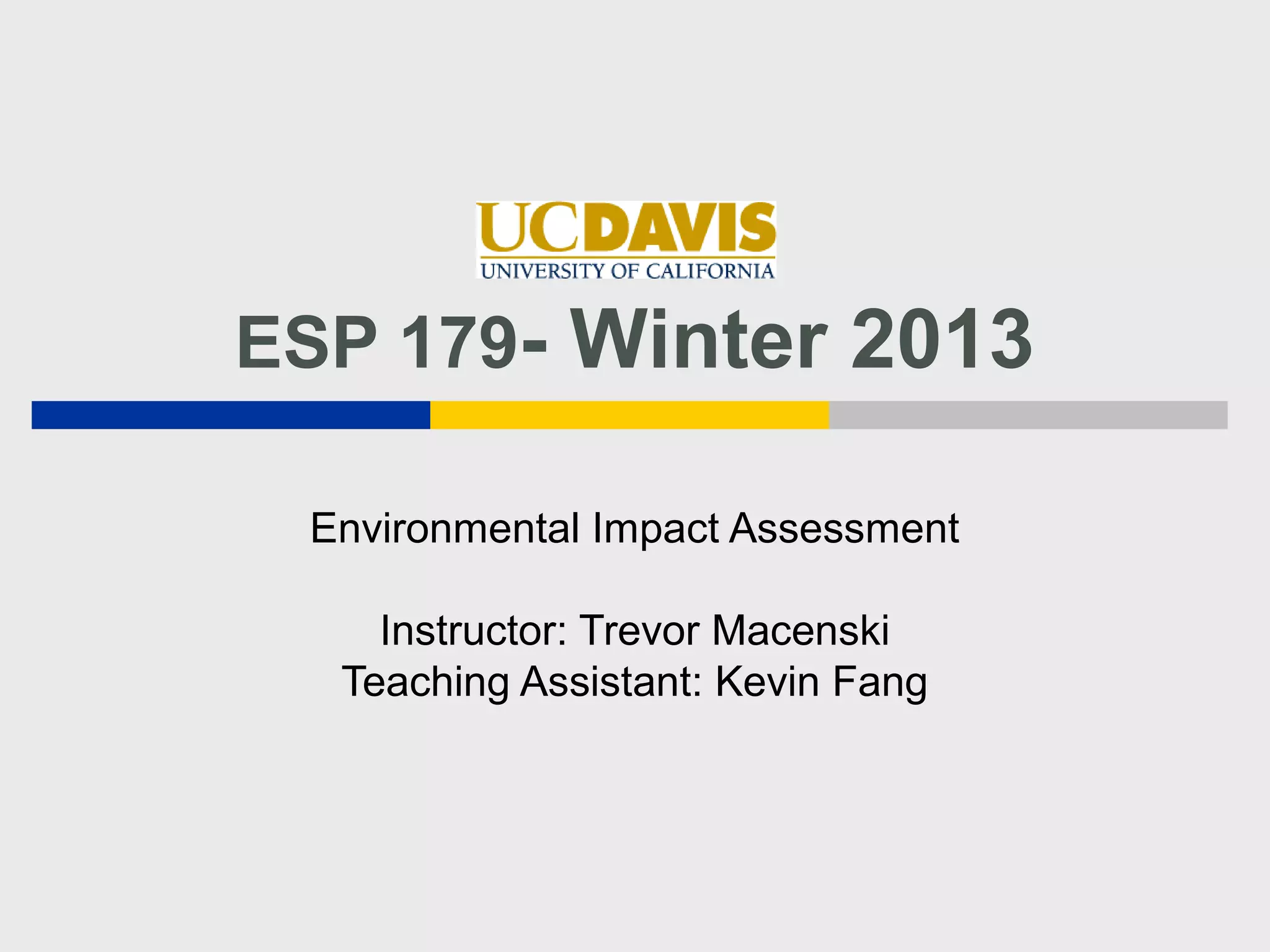 This document provides information about the ESP 179 - Winter 2013 Environmental Impact Assessment course at UC Davis. The instructor is Trevor Macenski and the teaching assistant is Kevin Fang. The class has a capacity of 85 students and those on the waitlist should speak to the instructor after class. Contact information is provided for the student affairs officer. Brief biographies of the instructor and TA are included. The course objectives are outlined as well as an overview of how the class will be structured and graded. Reading assignments and an introduction to environmental impact assessment are discussed.