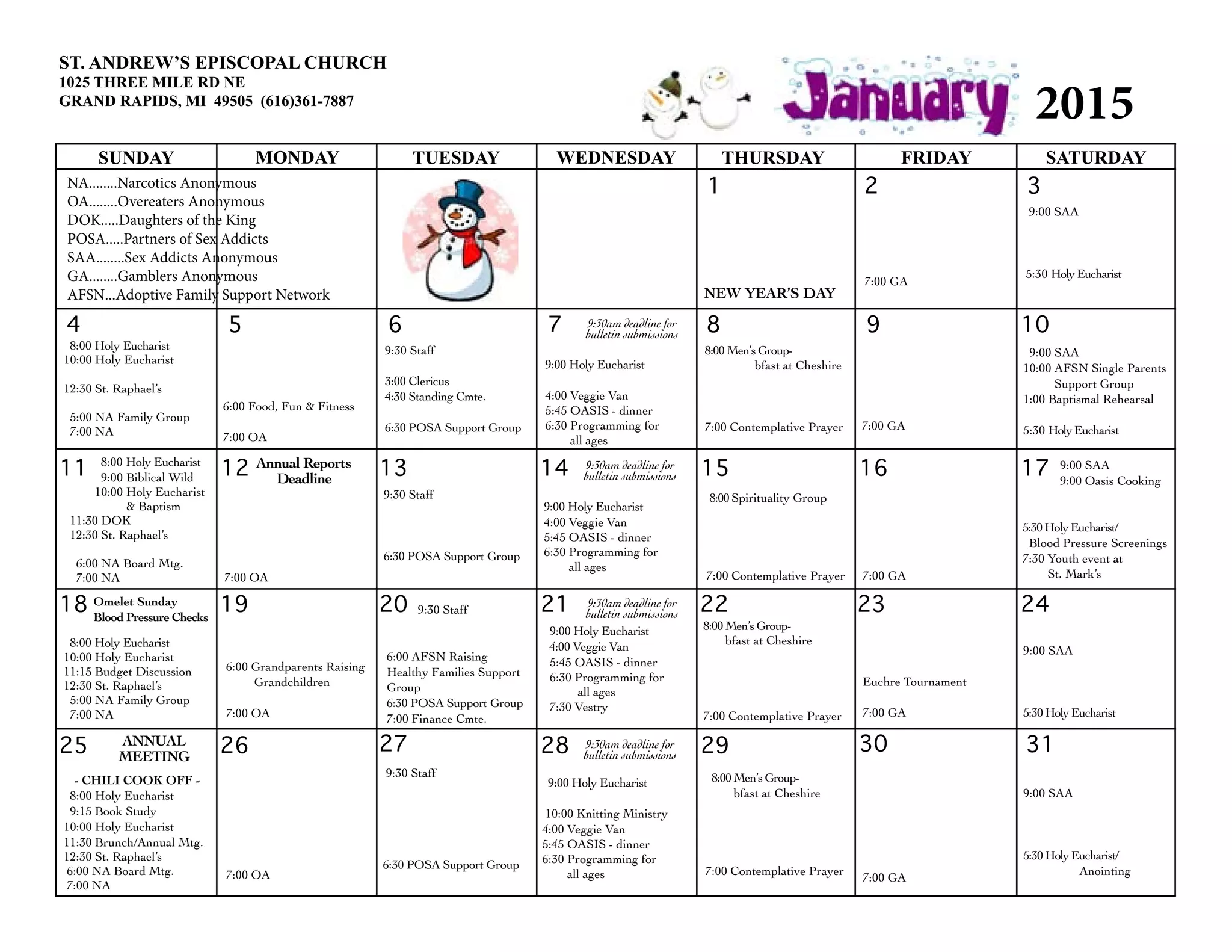 This document contains the schedule of events for St. Andrew's Episcopal Church for January 2015. It lists the daily and weekly activities, meetings, services and groups held at the church, including staff meetings, prayer groups, 12-step recovery meetings for addictions, religious services, cooking classes and family support groups. The schedule provides times and days for over 30 recurring events at the church throughout the month.